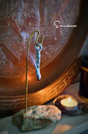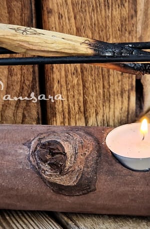 3. Una vez que la llama se apague, coloca el extremo encendido del palo santo en la parte ahuecada o sobre el quemador de madera.